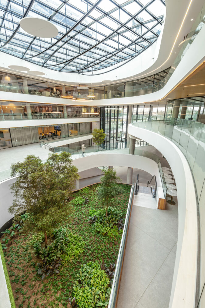 Lors de la conception, une approche holistique de la durabilité a été choisie, créant un écosystème exemplaire pour les décennies à venir. Le bâtiment durable génère lui-même l’énergie nécessaire à toutes les activités internes et aux équipements, sans utiliser de combustibles fossiles. Cela a valu une triple certification unique, démontrant également un engagement fort envers la santé, le confort et le bien-être.