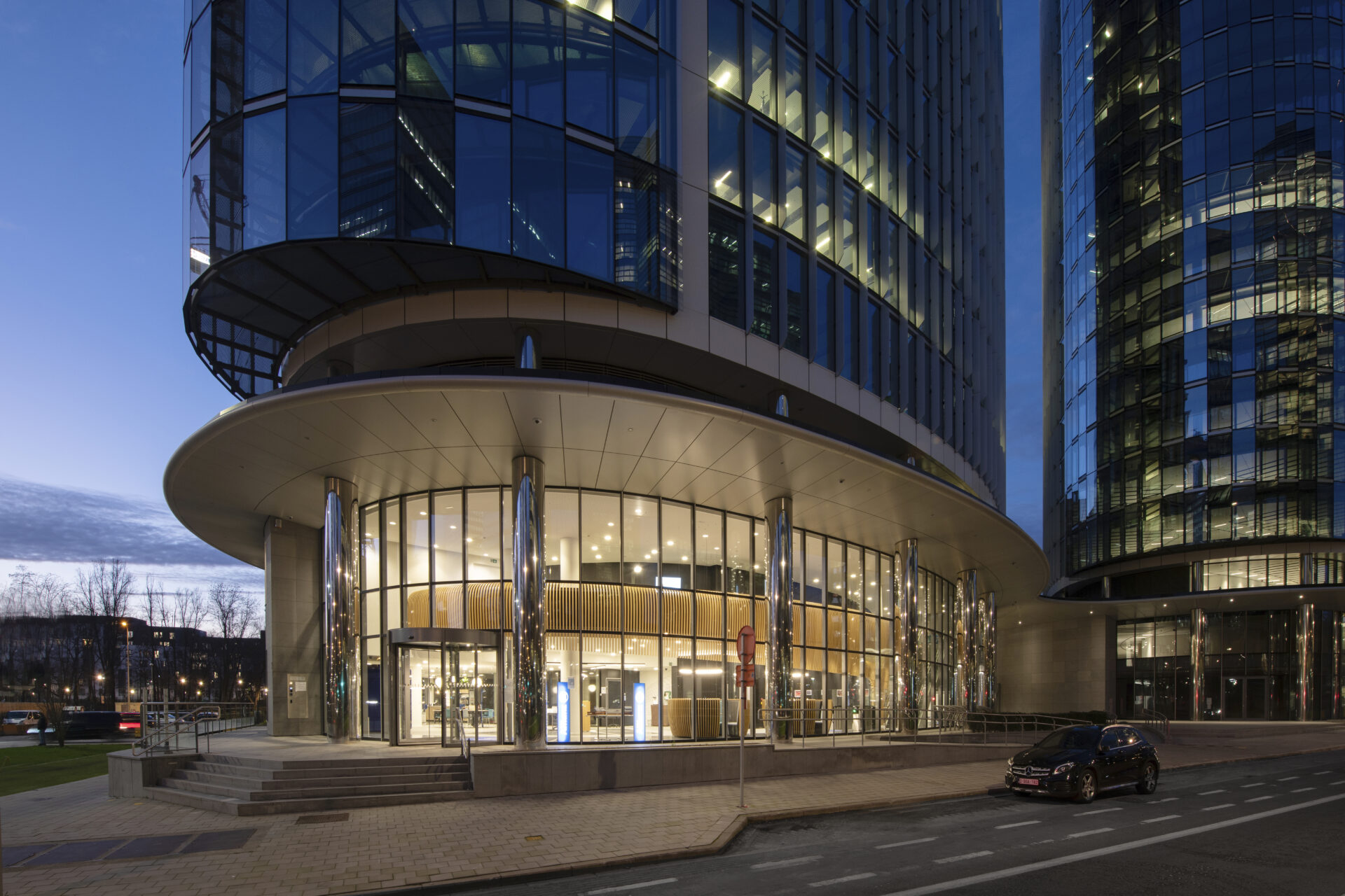 Situé le long de l’axe principal du Quartier Nord à Bruxelles, à quelques pas de la gare, ce projet veut rompre avec la massivité générale des bâtiments et la politique de socle abritant les services les moins nobles des immeubles. Dans cette optique, ce sont deux tours, sœurs et non jumelles, qui développent environ 62.000 m² sur le site.