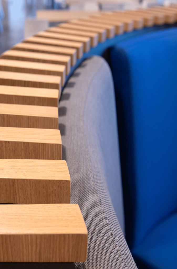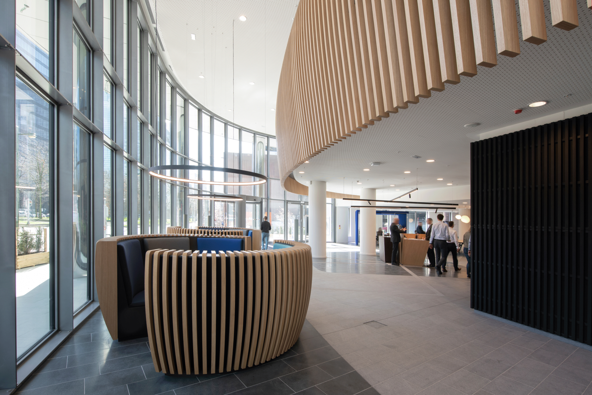 Leurs rez-de-chaussée et premiers étages accueillent, tout en transparence et en lien direct avec l’espace public, les entrées, le foyer d’une salle de conférence, un commerce, les cafétérias et les salons. Les piétons longeant ces façades sont abrités des courants d’air par un auvent, ample et souple, intégrants les deux tours dans un seul geste urbain.