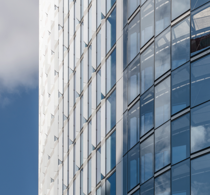 Avec la volonté de respecter les objectifs de durabilité, les façades se particularisent suivant les orientations : des éléments fixes, différents par chaque orientation, offrent aux occupants des conditions de confort optimal sans d’importantes consommations énergétiques. Ces éléments fixes animent les tours, en découpant leur volume principal en sous-ensembles : leurs proportions n’en sont que plus élégantes encore.