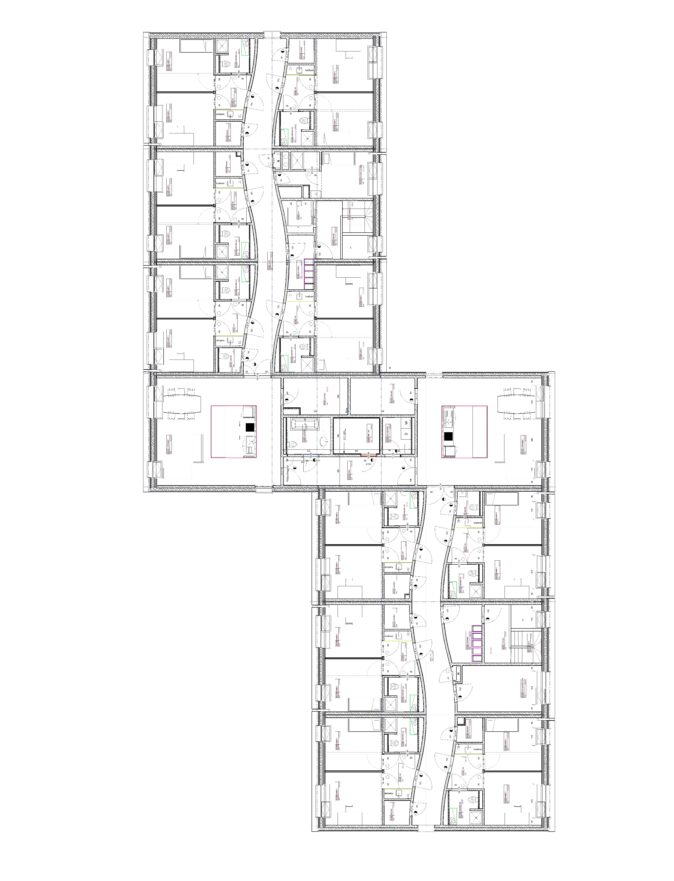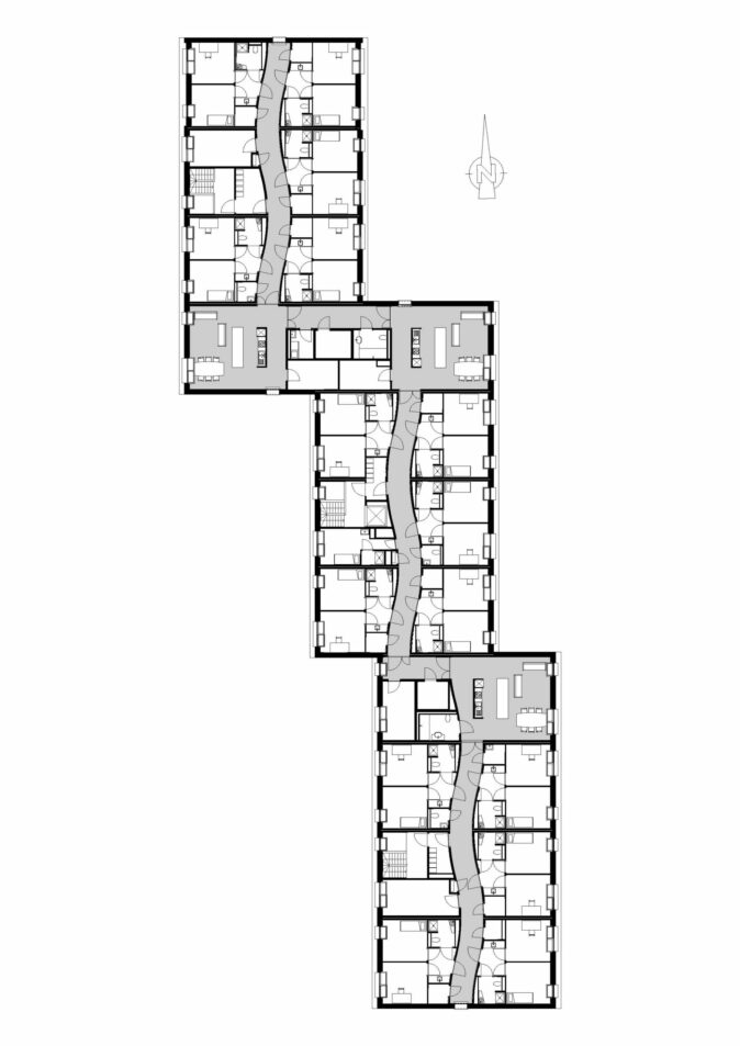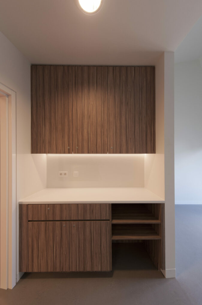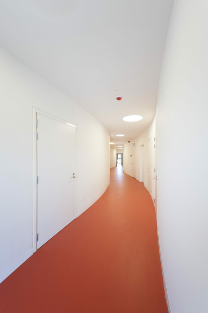 L’une des caractéristiques les plus marquantes de l’intérieur est le tracé légèrement sinueux des couloirs. Le choix de ce mouvement ondulatoire est délibéré. Cette forme reposante rompt avec l’image de l’« institution » et offre au résident la possibilité d’explorer discrètement l’environnement, sans faire face à la longueur entière du couloir. De plus, le couloir est ainsi débarrassé des recoins et des éléments durs auxquels on peut se blesser ou s’accrocher. Pour des raisons similaires, le choix s’est porté sur un chauffage par le sol en lieu et place de radiateurs et des cadres de porte en acier à joints creux ont été installés.