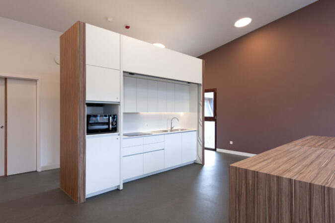 Les problèmes spécifiques, entre autres la sensibilité aux stimuli, propre aux personnes autistes, nécessitent un concept d’habitation ménageant un espace individuel suffisant. Les groupes de vie se composent de 5 résidents aux besoins similaires. Compte tenu de la grande différence dans les besoins individuels, il est très important de disposer d’une infrastructure qui permette une différenciation dans le concept de logement. Les logements ont ainsi été équipés de parois mobiles, de sorte que chaque studio peut être agencé de 3 manières et adapté aux possibilités uniques de chaque résident. Cette adaptabilité se retrouve également dans le mobilier fixe.