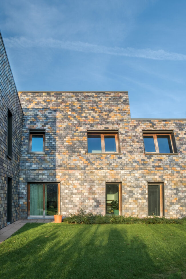 Chaque groupe d’habitation comprend 5 logements, qui sont individuellement mis en valeur par une variation des hauteurs de corniche. Cette variation est obtenue en inversant la direction du toit en pente, ce qui crée une articulation des façades qui s’inscrit dans l’échelle de l’environnement. Les façades sont revêtues d’ardoises naturelles d’Afrique du Sud, soigneusement sélectionnées dans une palette de couleurs variées.