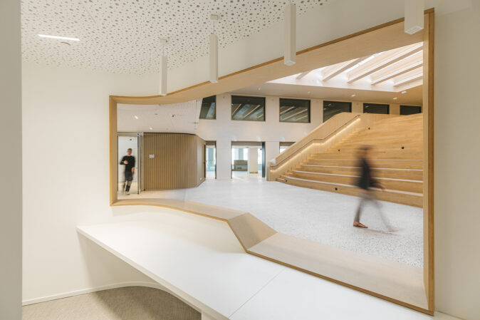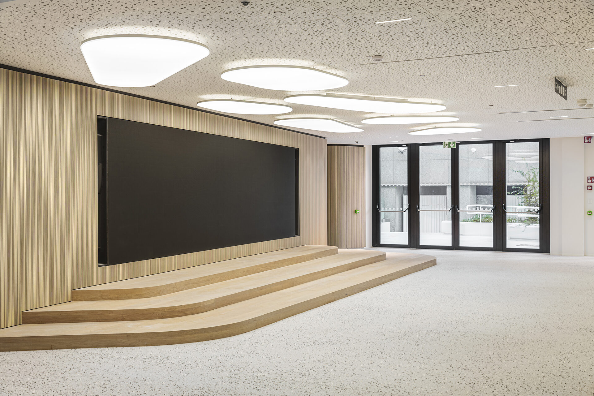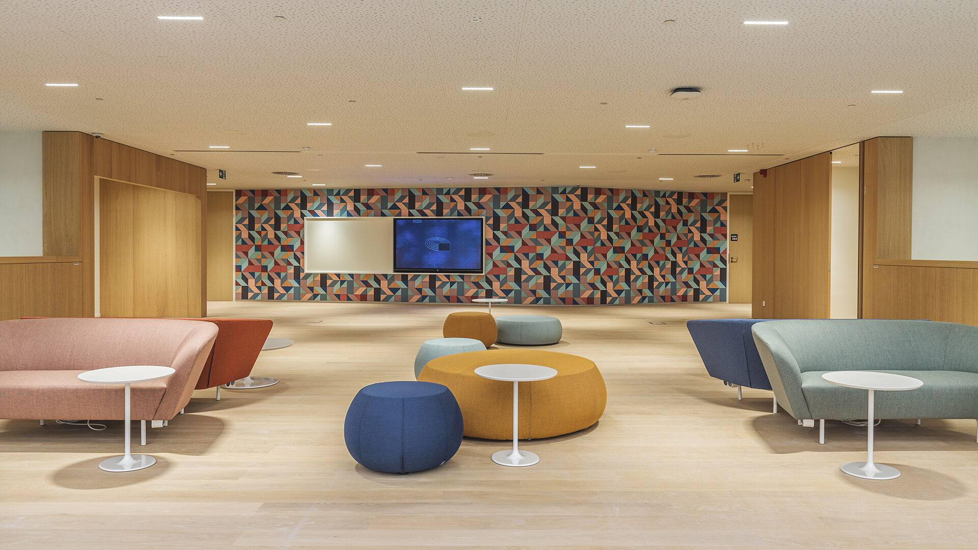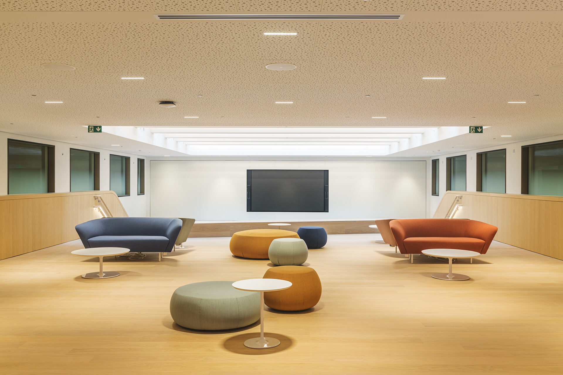 Outre sa plus-value esthétique et fonctionnelle, cette intervention a également résolu le problème de la sécurité incendie. Au cœur de cet espace baigné de lumière naturelle trône une grande estrade en bois (matériaux recyclable et intéressant en matière de CO2), qui sert à la fois de gradins pour assister à des présentations et d’escalier pour accéder à un espace lounge polyvalent au niveau +1, habillé d’un mur aux couleurs vives.