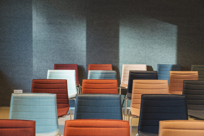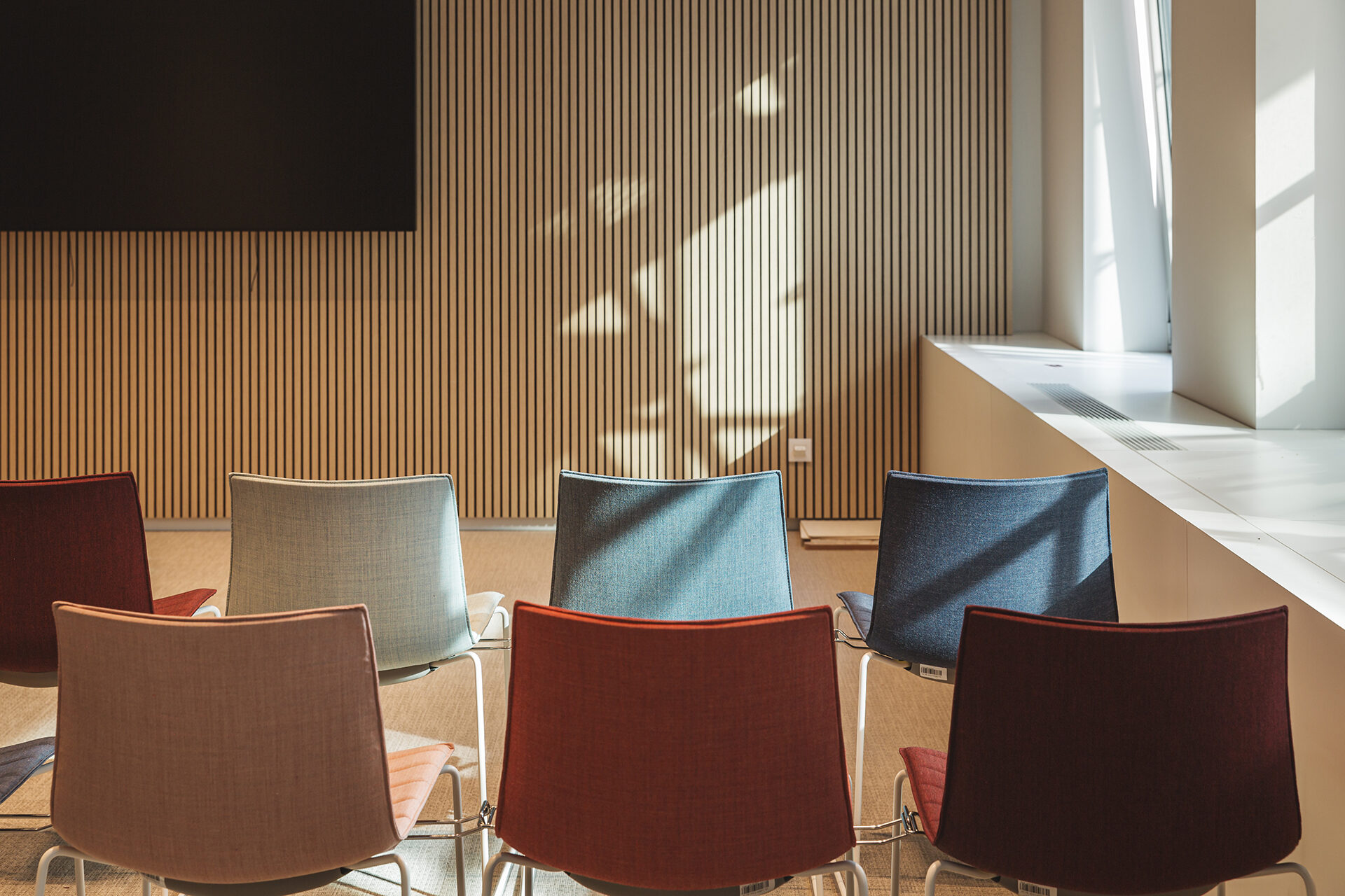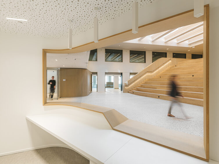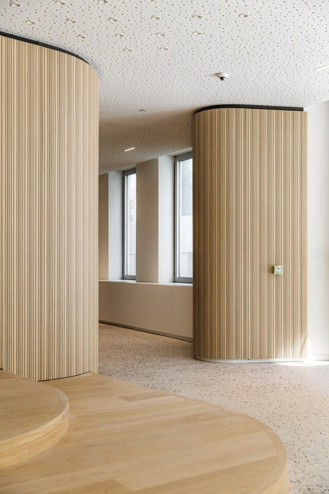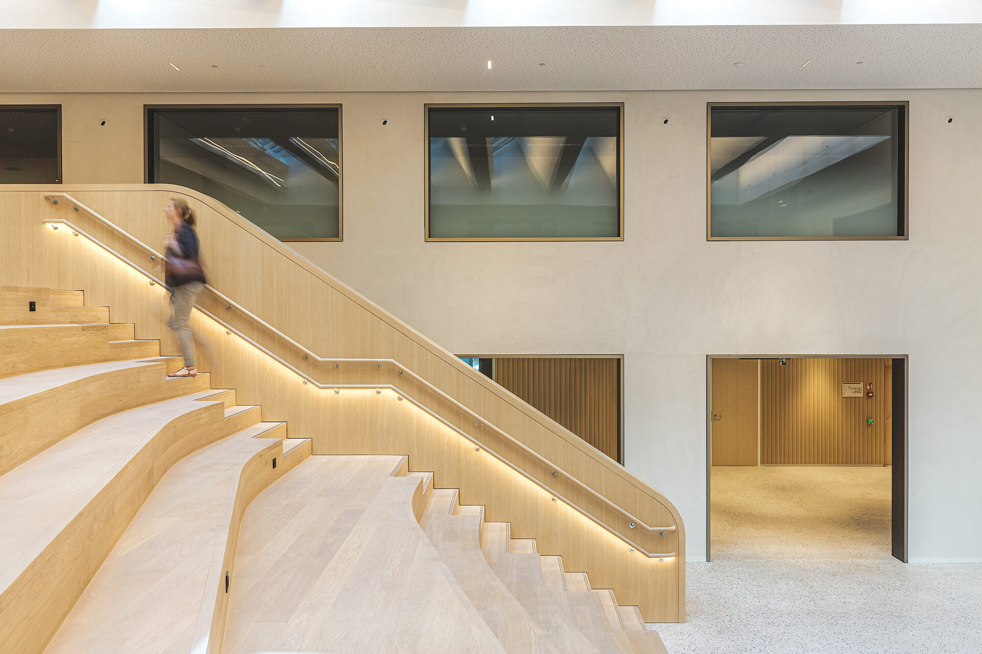 Outre sa plus-value esthétique et fonctionnelle, cette intervention a également résolu le problème de la sécurité incendie. Au cœur de cet espace baigné de lumière naturelle trône une grande estrade en bois (matériaux recyclable et intéressant en matière de CO2), qui sert à la fois de gradins pour assister à des présentations et d’escalier pour accéder à un espace lounge polyvalent au niveau +1, habillé d’un mur aux couleurs vives.