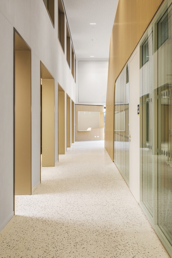 Sous l’estrade est logée une grande salle de séminaires aux parois latérales vitrées, et une seconde encore à l’arrière. Ces salles sont divisibles grâce à des parois acoustiques coulissantes, dissimulables dans du mobilier pensé à cet effet. Une dizaine de plus petites salles de séminaires se répartissent le long des façades, profitant ainsi de lumière naturelle. On trouve enfin des noyaux pour les sanitaires, ascenseurs, escaliers de secours mais aussi pour les techniques supplémentaires requises par la transformation d’espaces de bureaux en salles de réunion.