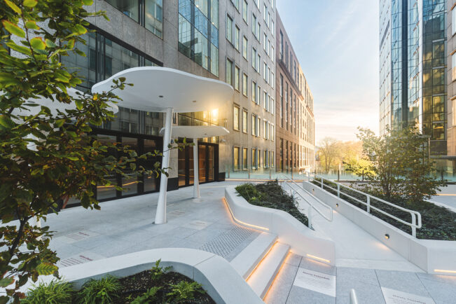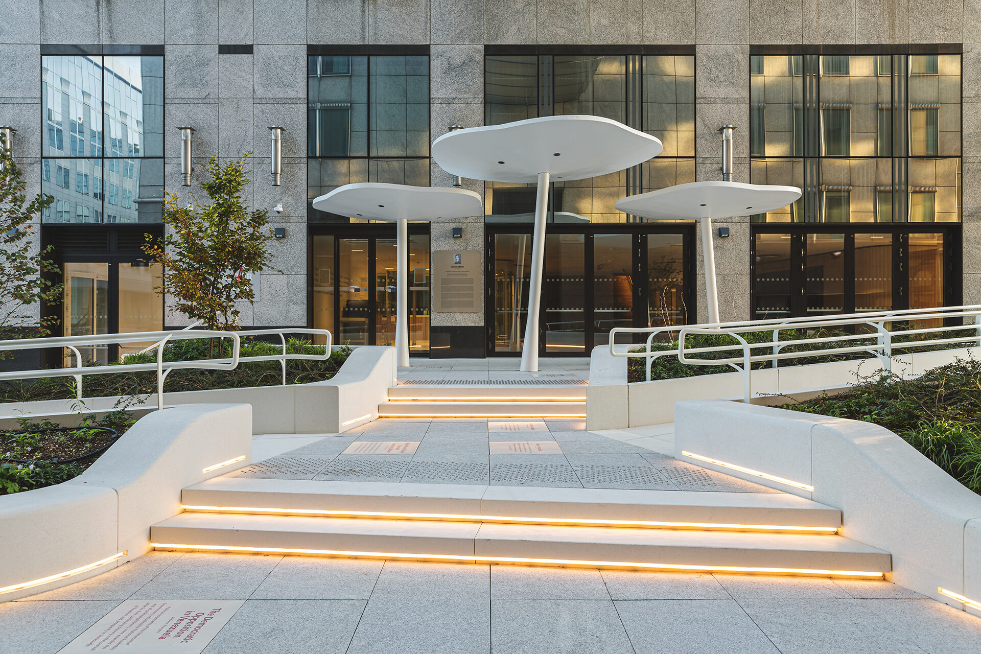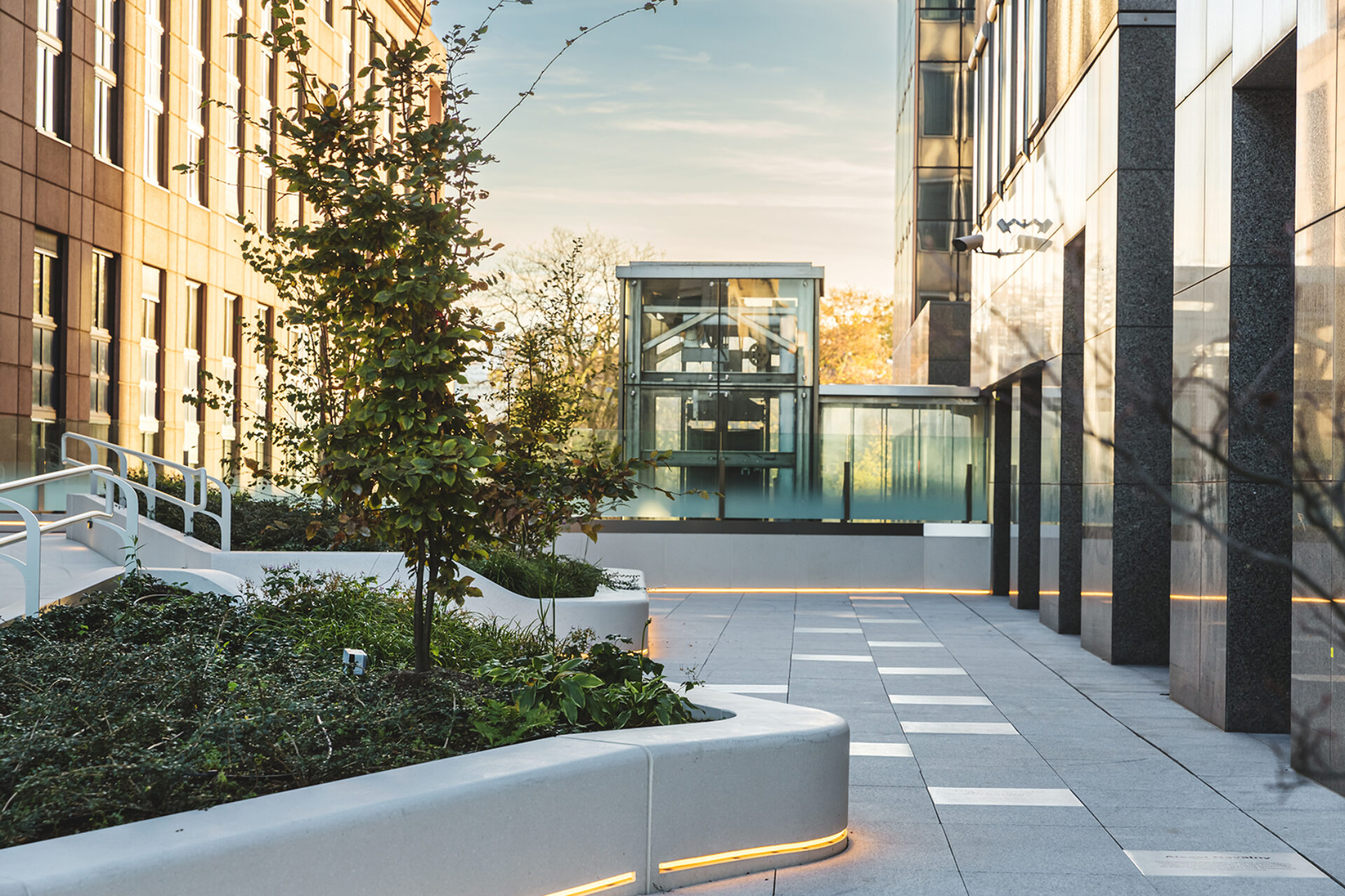 La création d’une esplanade verte accueillante devant l’entrée principale du bâtiment (Sakharov lounge) apporte une respiration bienvenue au sein d’un environnement minéral. Le sol de cette esplanade accueille les dalles commémoratives des prix Sakharov, d’où son nom.